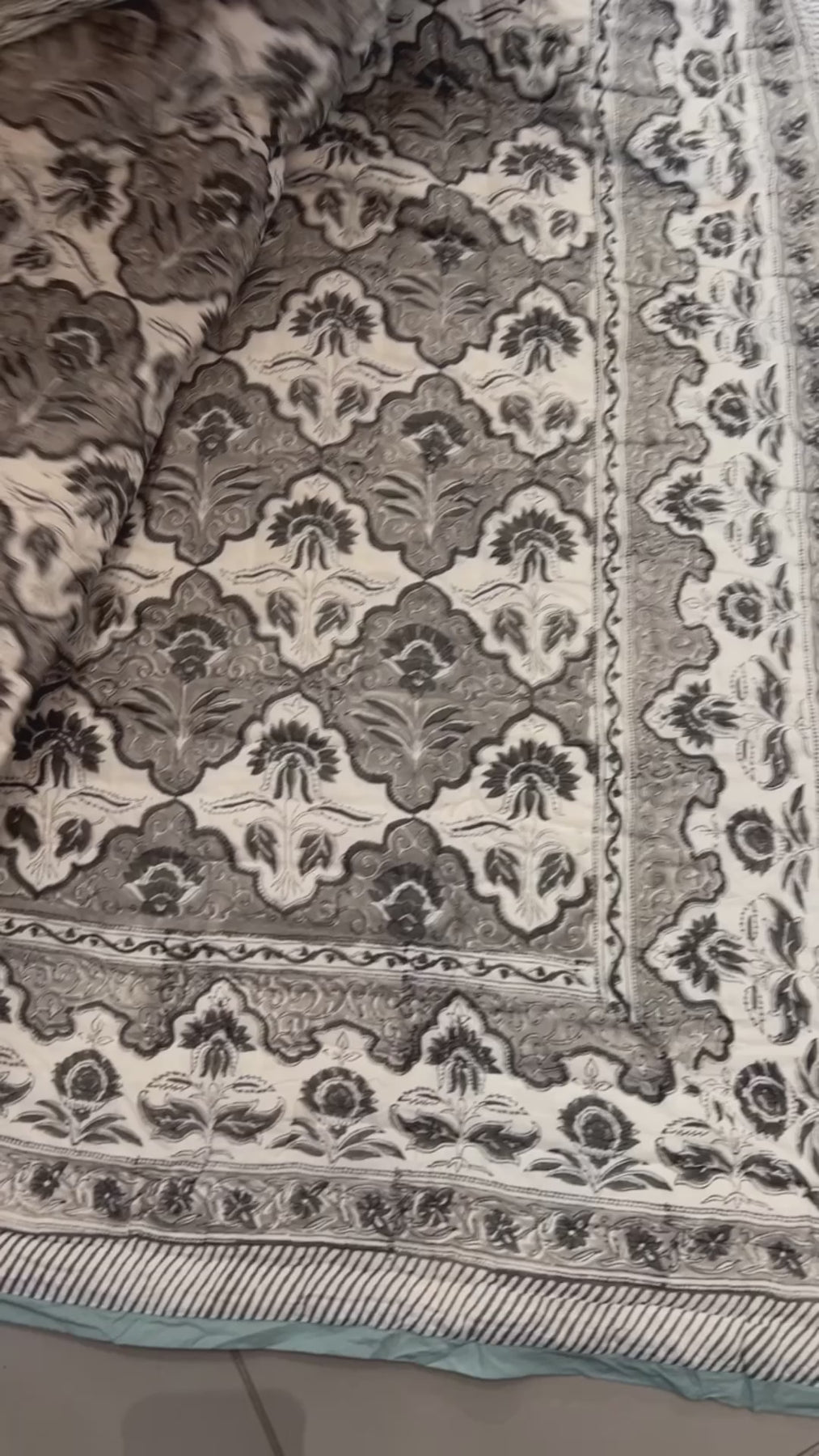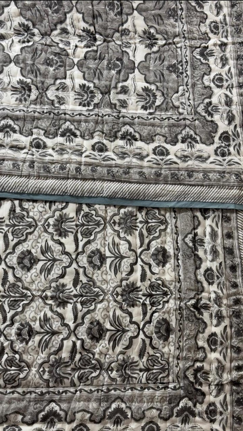 A handmade Rajasthani block printed quilt, made from hand stitched organic cotton and finished with a warm, puffy filling, with a beautiful complementary patterned reverse.