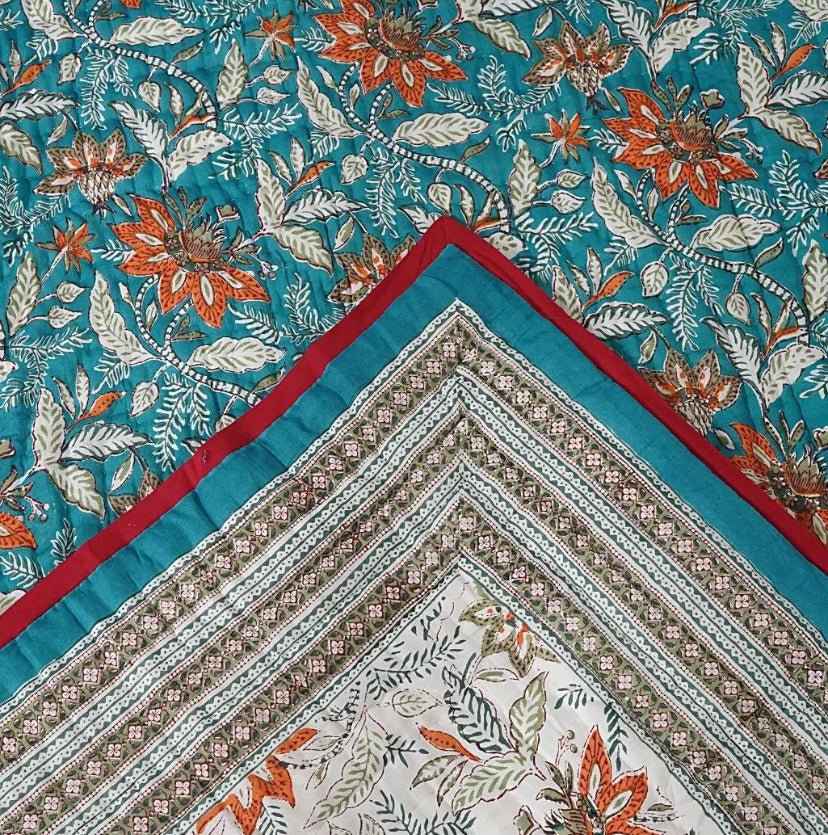 A hand made Rajasthani block printed and hand stitched quilt, filled with a warm puffy cotton filling and enhanced with a beautifully complementary design on the reverse.