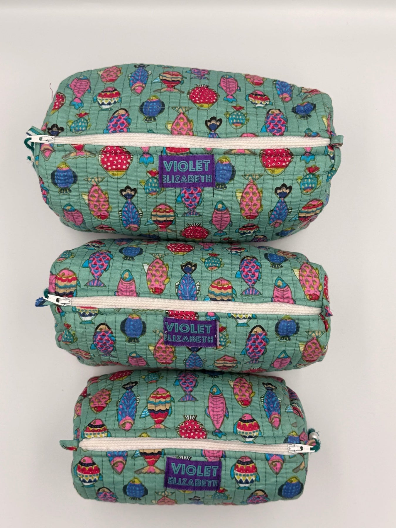 Handmade cotton wash bags, made with bright and vibrant traditional block printed cotton fabric. The outer cover is a cotton kantha fabric with a waterproof plastic lining. Each bag has a beaded tassel on the zip, perfect for your trip away.