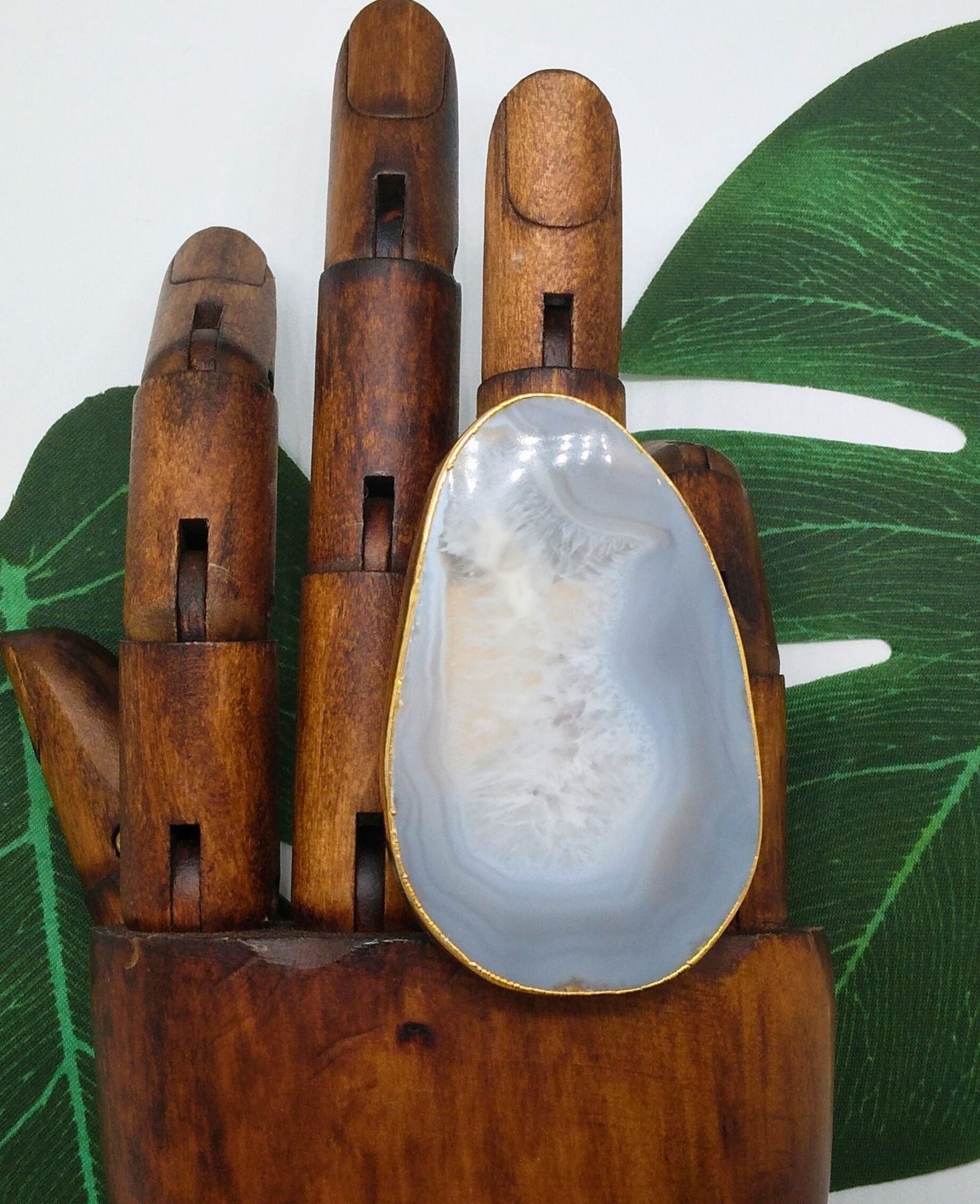 This unique large silver agate slice ring will have heads turning! Set in 18k gold triple plated brass, it’s adjustable and fabulous!