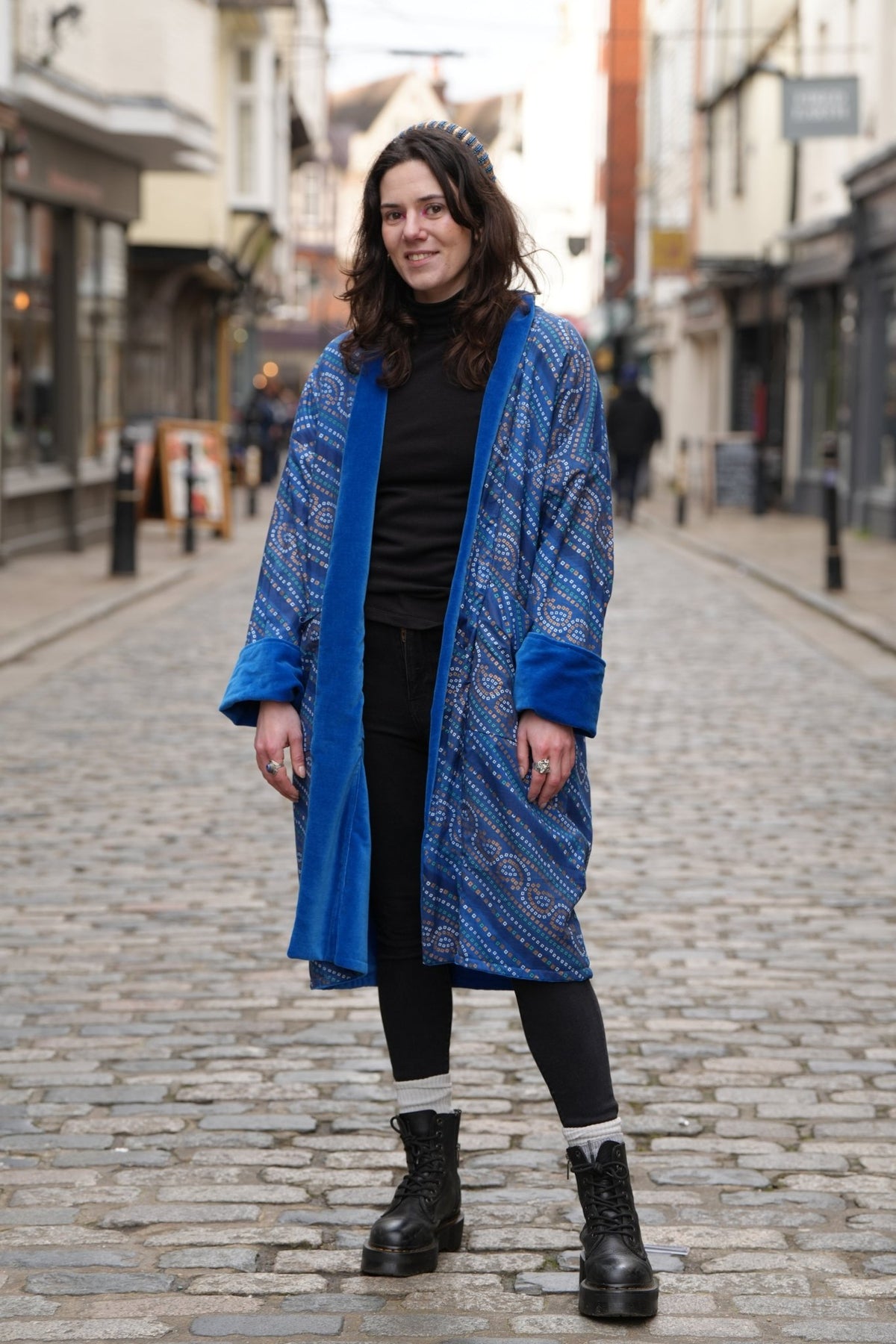 This handmade coat features a sumptuous cobalt blue velvet on one side and a Bandhini style screen printed Indian cotton fabric with copper detailing on the flip side. The coat is fully reversible, providing versatility as well as fabulous styling. It drapes beautifully, and is comfortable and suitable for all seasons. A perfect complement to any wardrobe.
