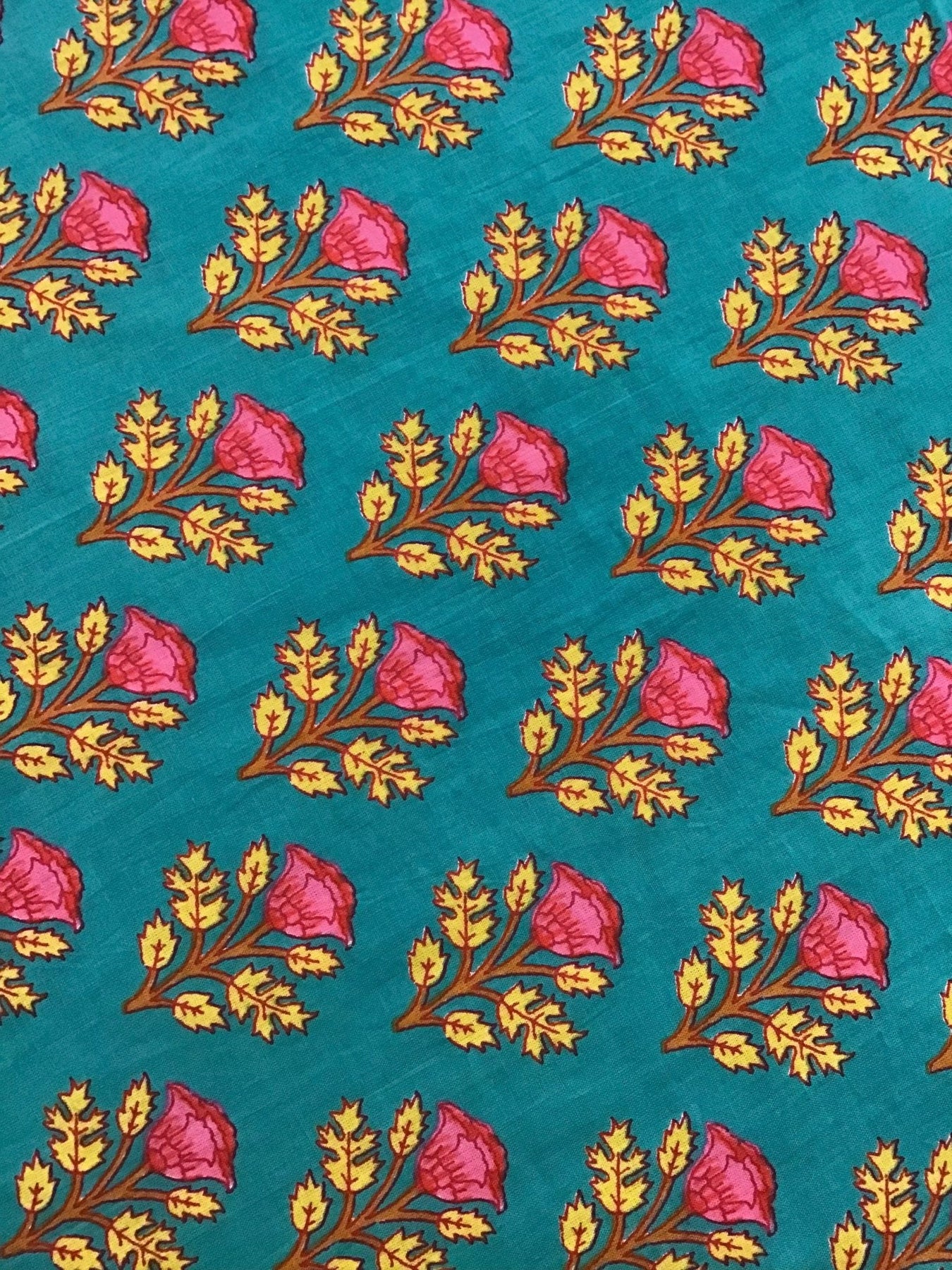 Screen printed cotton fabric featuring bold, colourful designs. Each print is hand screen printed in India on 100% cotton. Perfect for dressmaking, quilting, bags, and craft projects. Sold per metre.